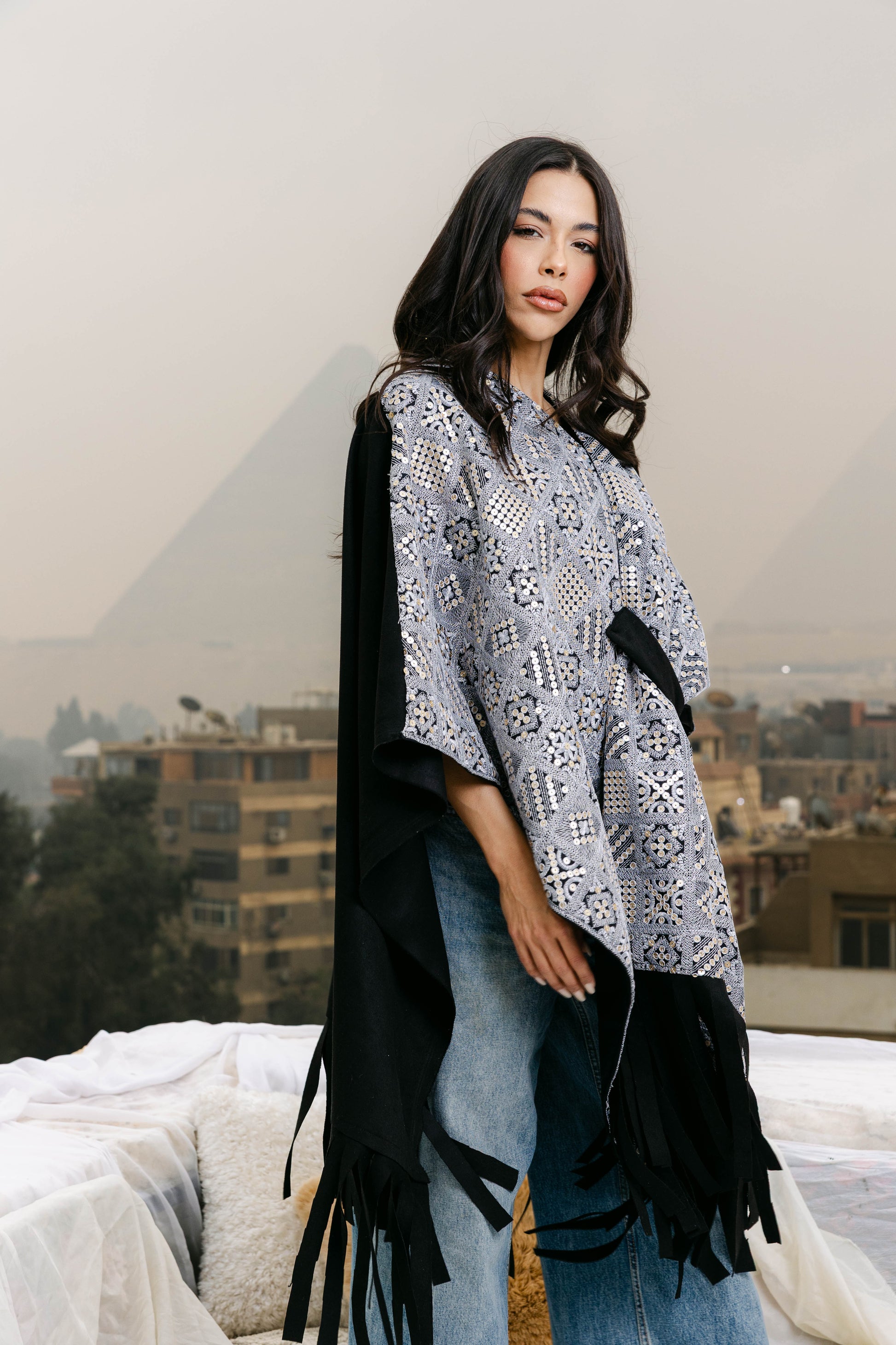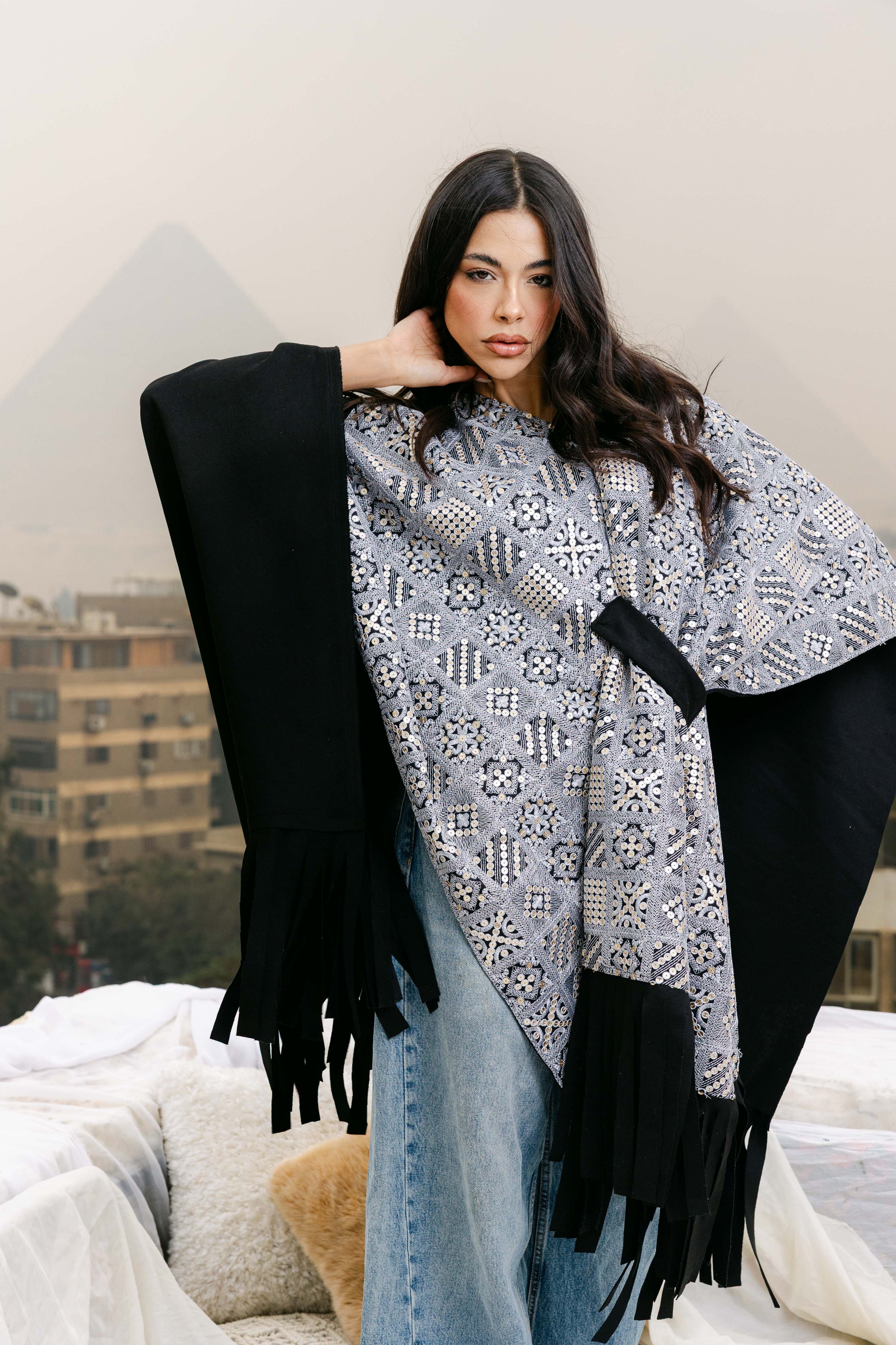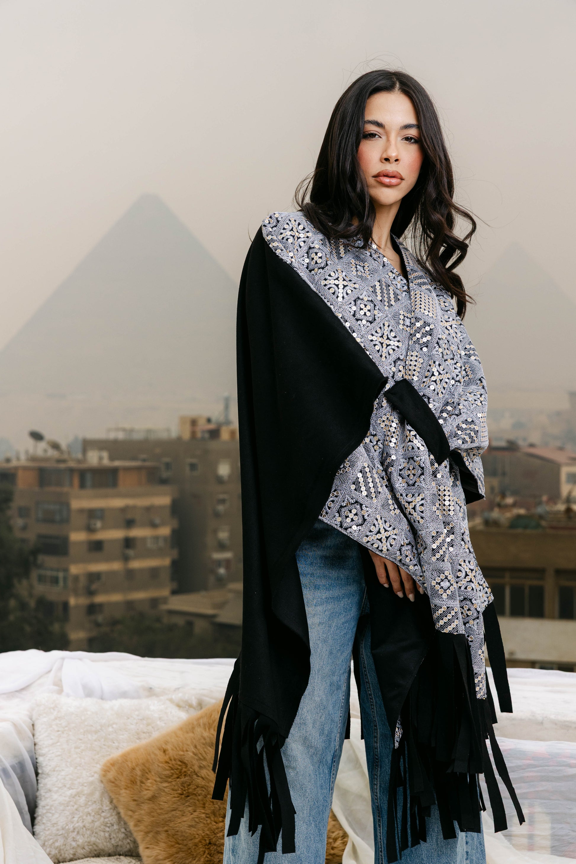 A beautifully crafted suede cape featuring intricate hand embroidery, perfect for Ramadan. Stylish and versatile, it’s ideal for both casual daytime looks and elegant evenings.