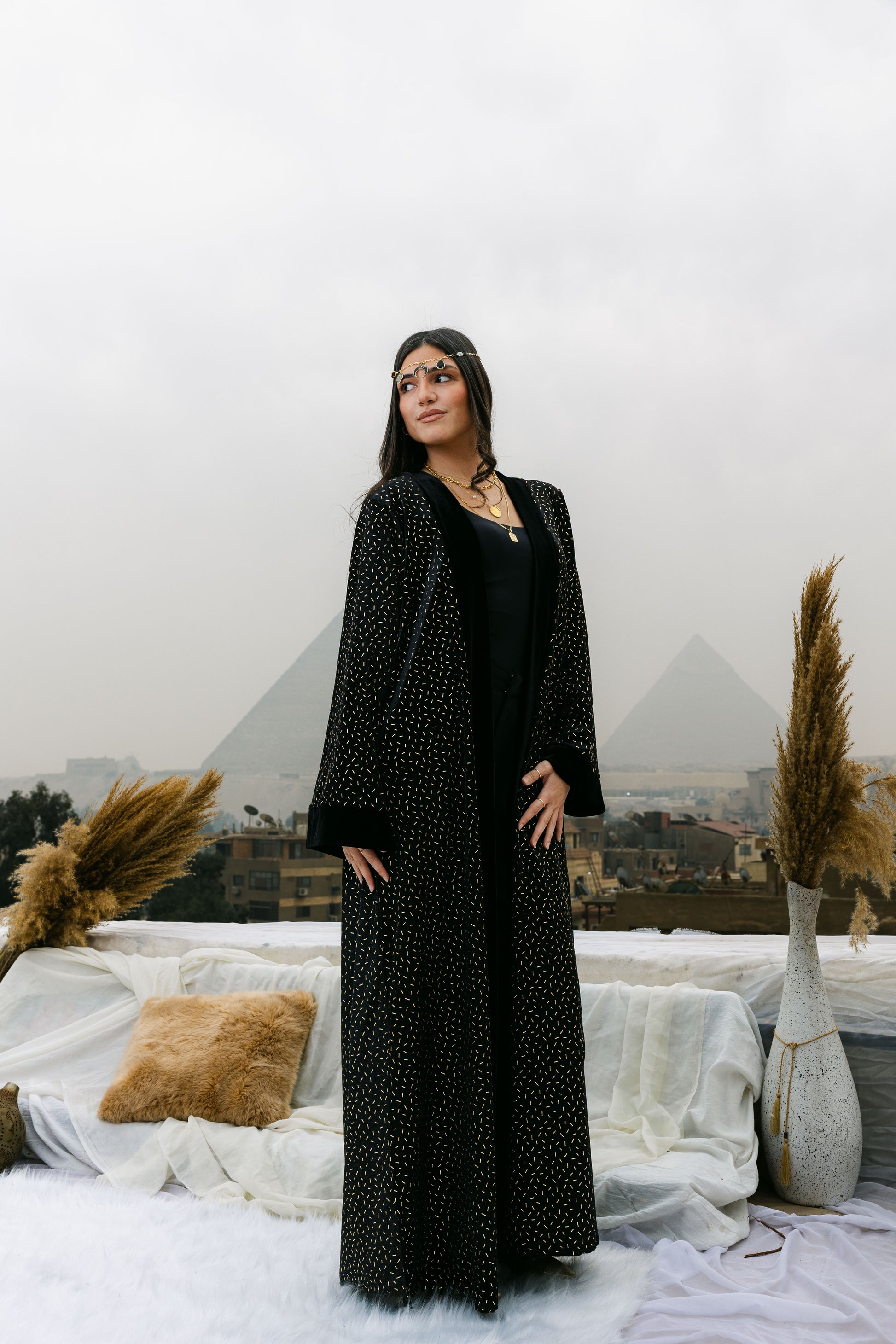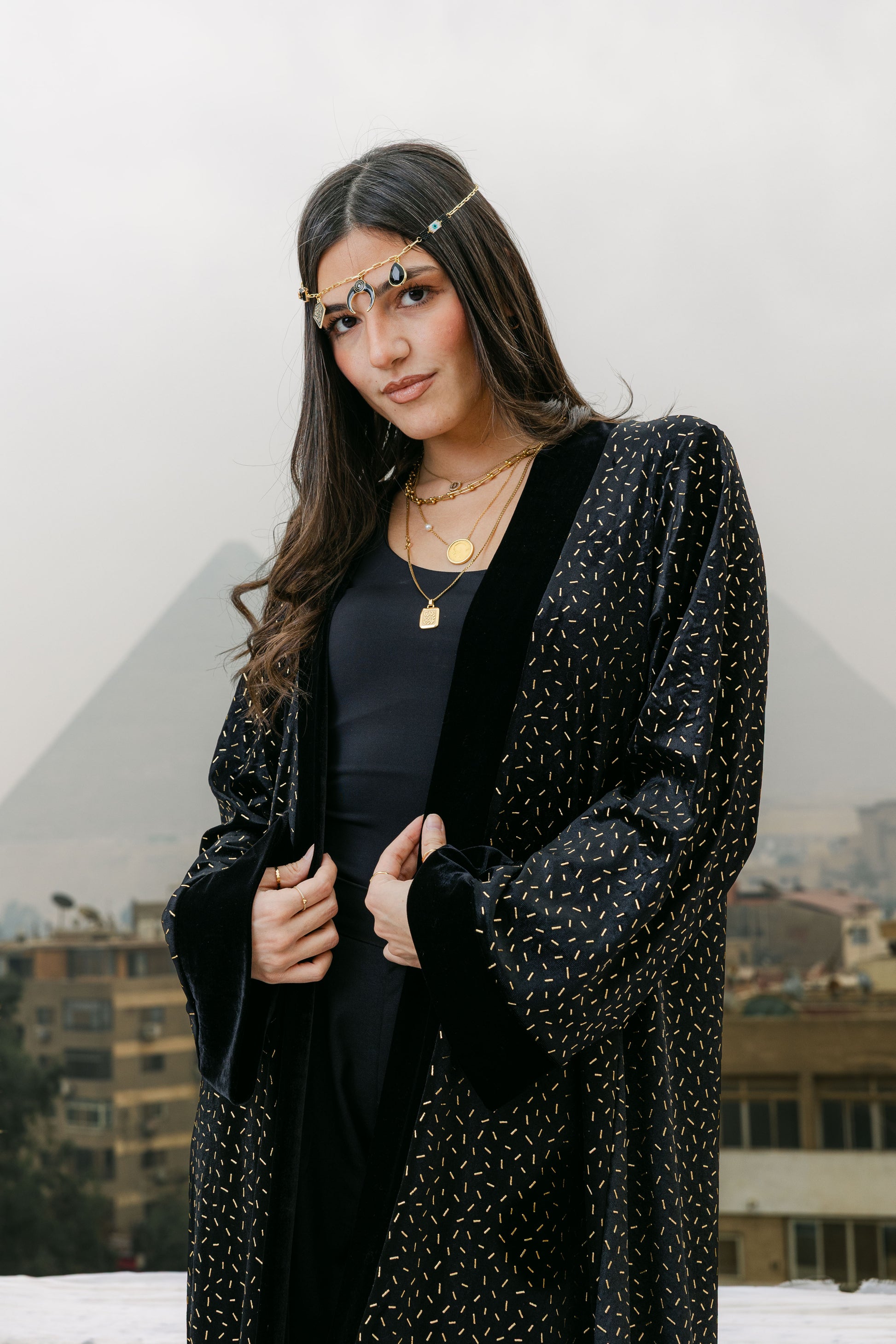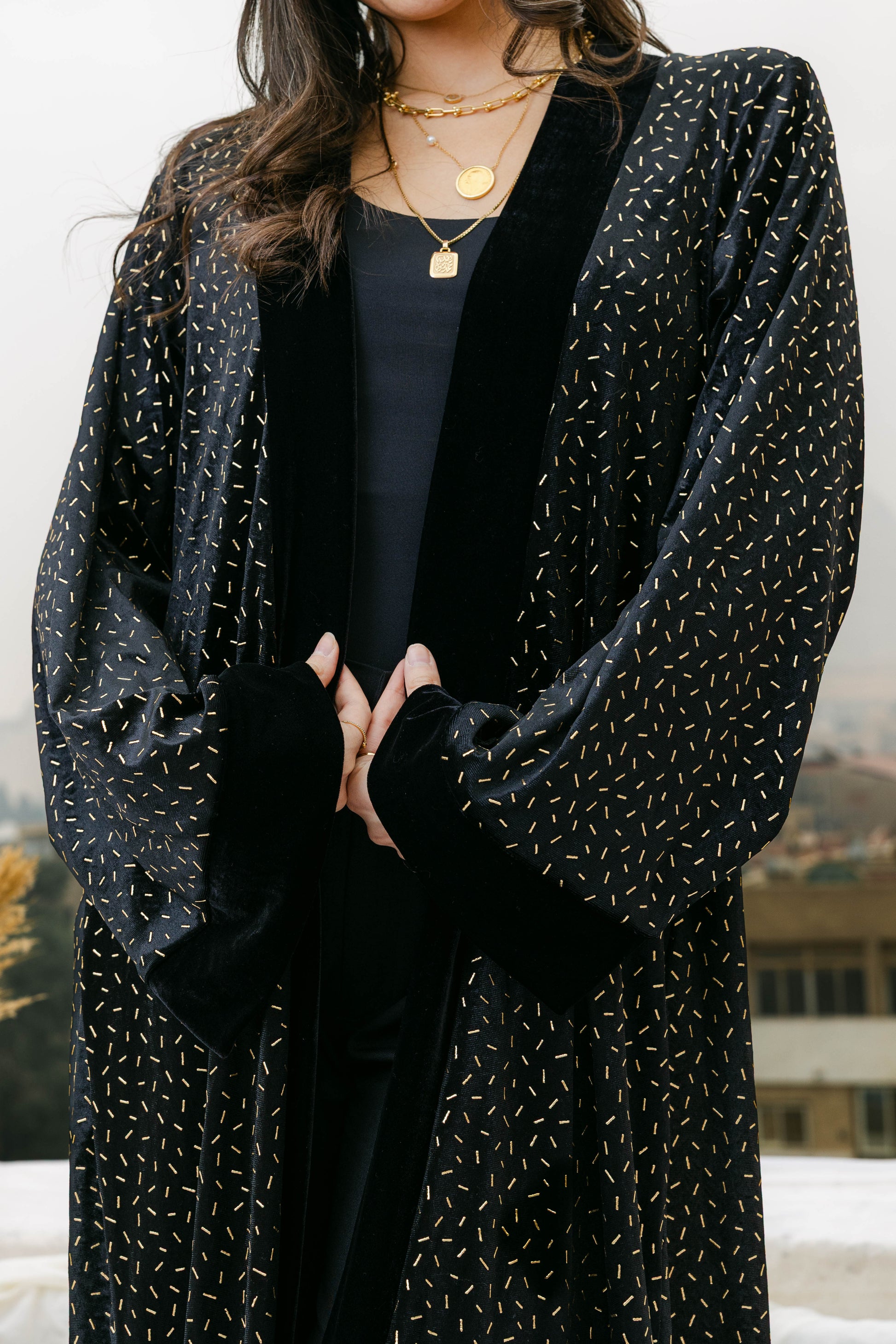 A luxurious velvet abaya elevated with subtle gold stud detailing for a refined statement look. Designed with a timeless silhouette, this piece blends elegance and modern glamour—perfect for Ramadan evenings and special occasions. ✨
