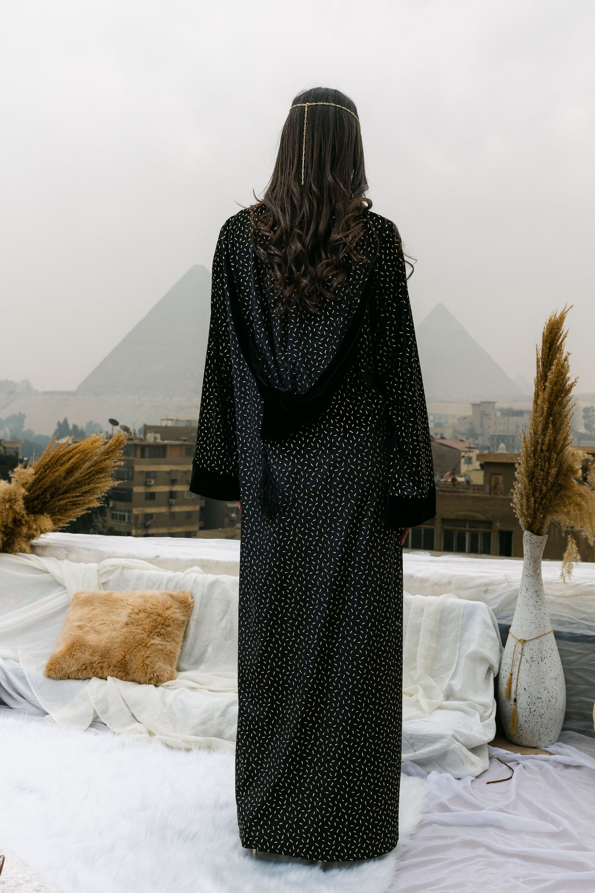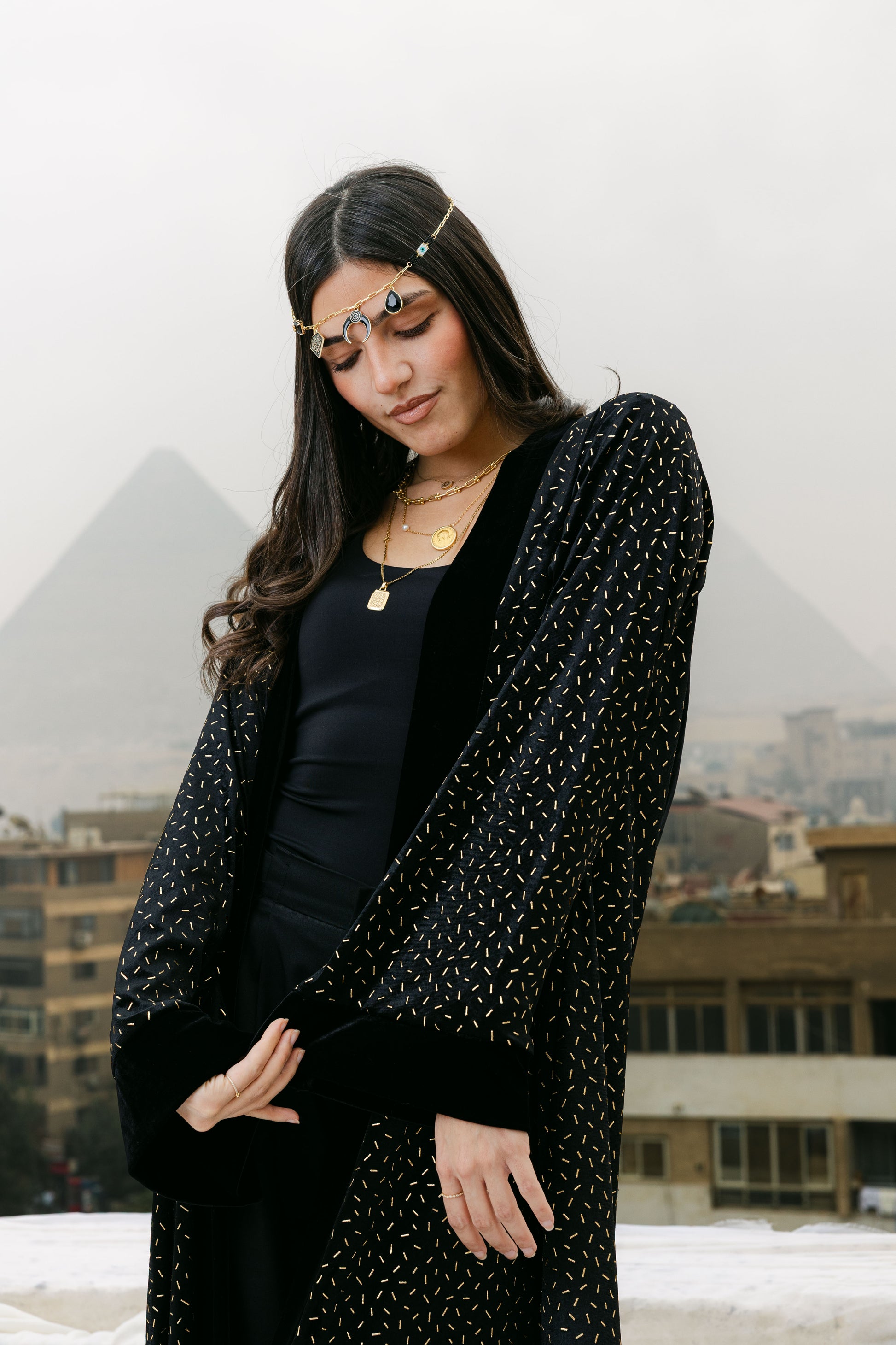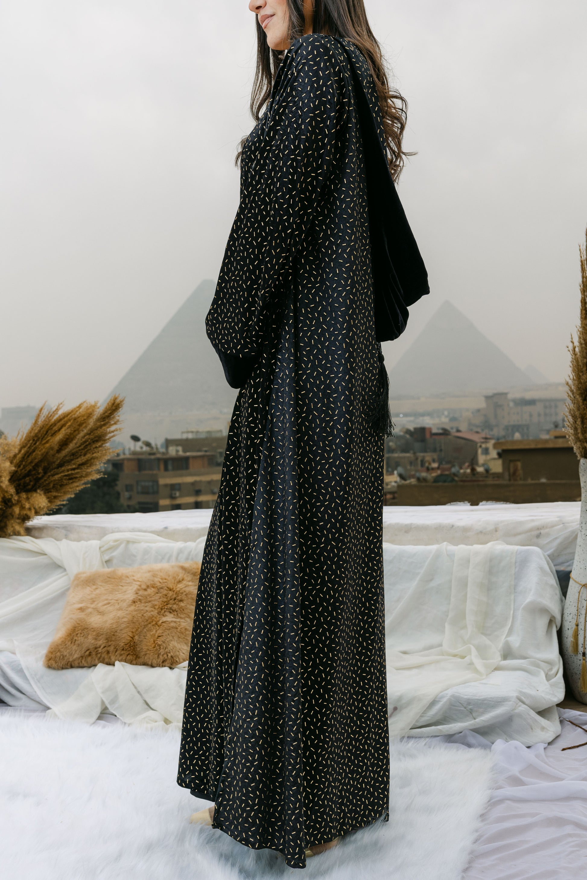 A luxurious velvet abaya elevated with subtle gold stud detailing for a refined statement look. Designed with a timeless silhouette, this piece blends elegance and modern glamour—perfect for Ramadan evenings and special occasions. ✨