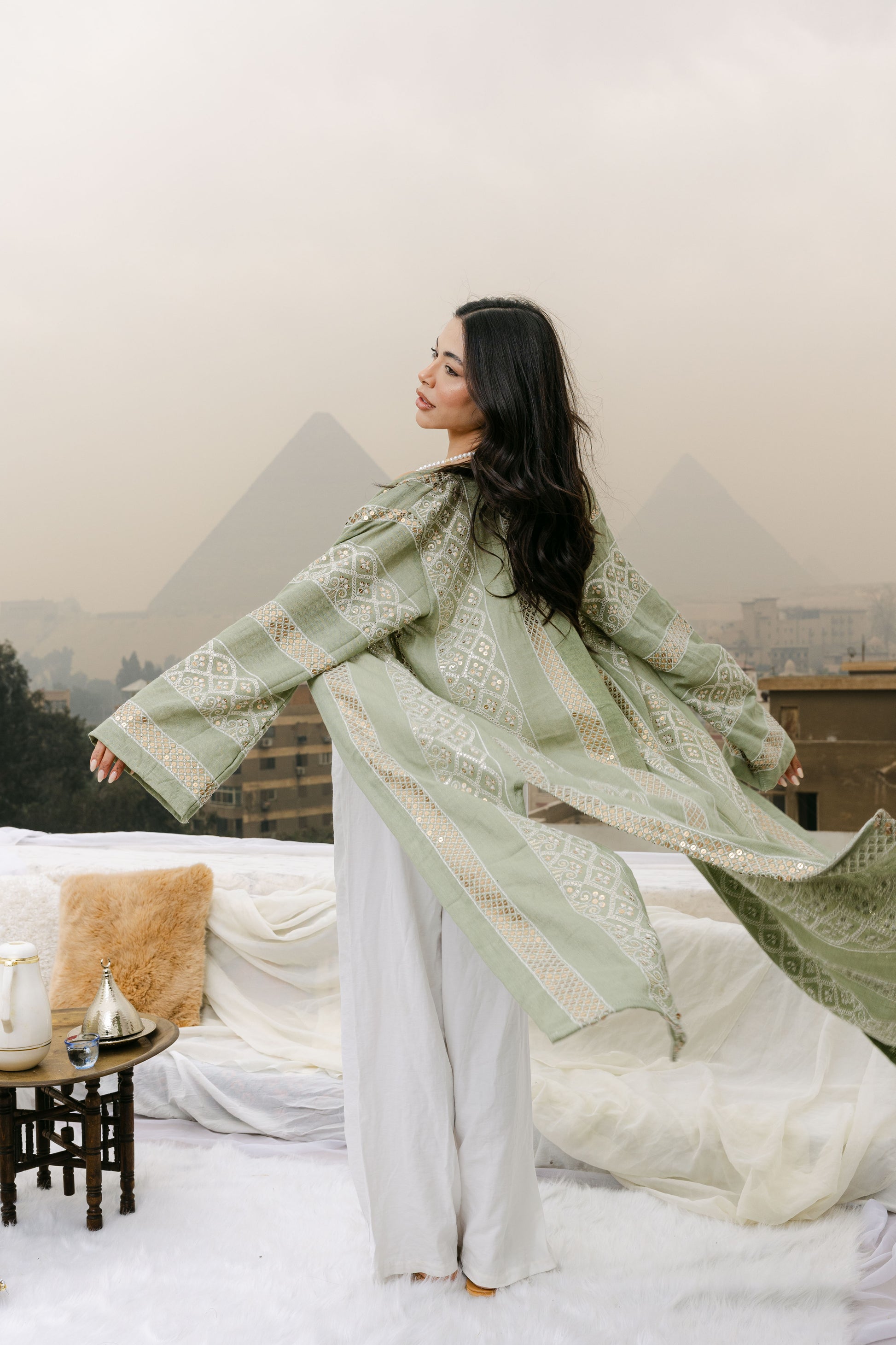 long linen cardigan, delicately embroidered for a refined and elegant look.