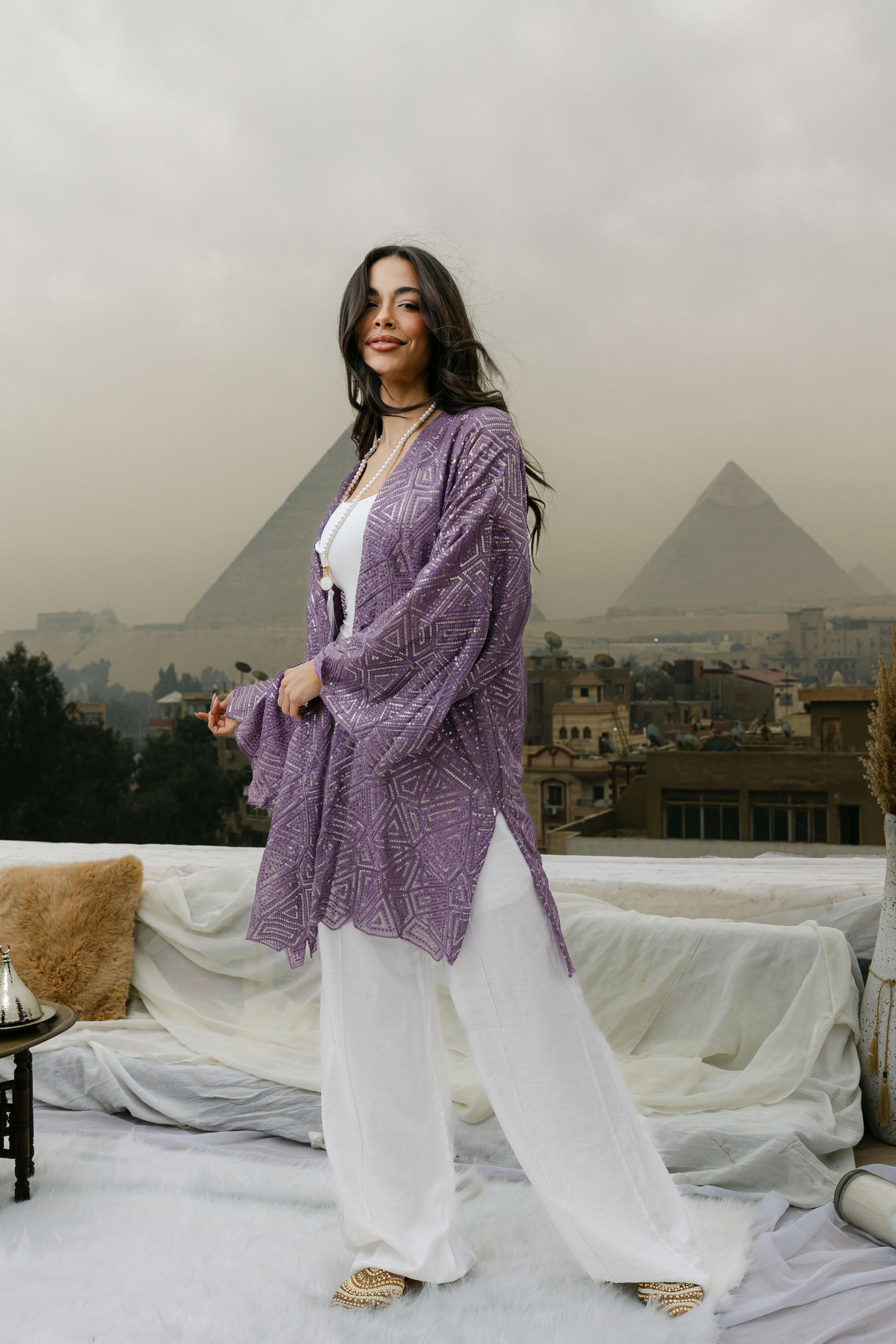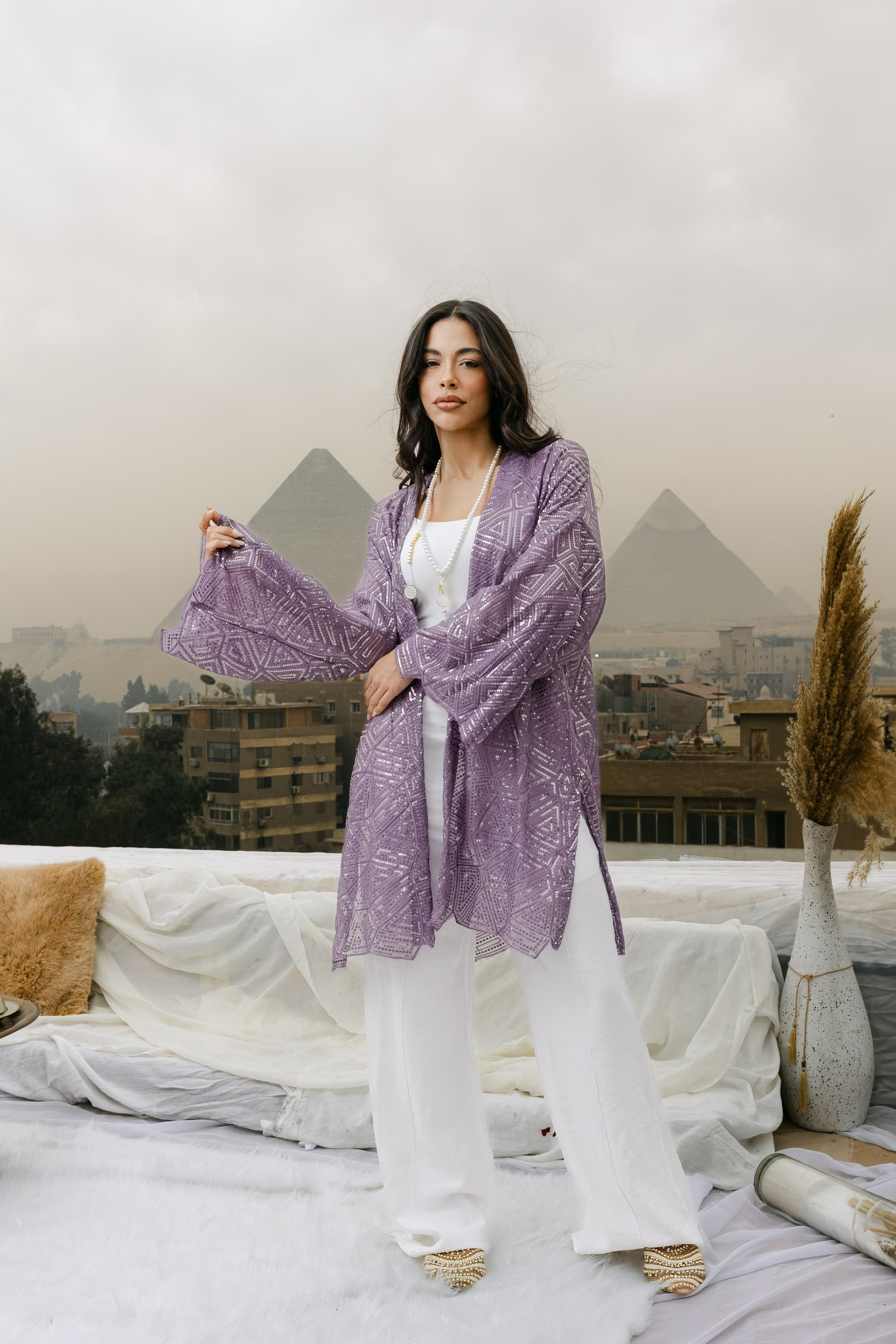 An elegant chiffon cardigan fully adorned with intricate embroidery and shimmering sequins. Light, graceful, and designed to catch the light beautifully perfect for Ramadan evenings and special occasions with a touch of refined glamour