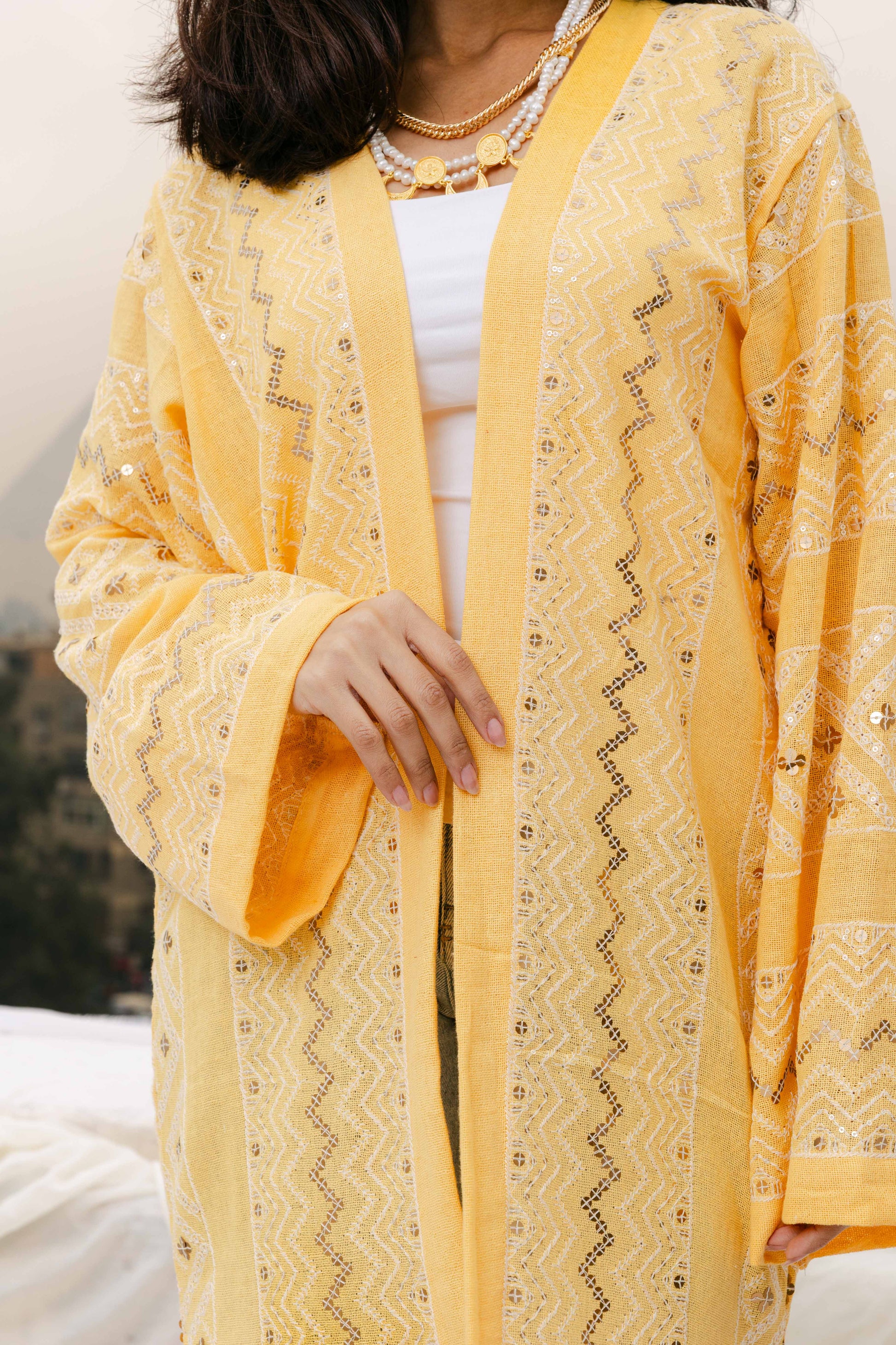 long linen cardigan, delicately embroidered for a refined and elegant look.