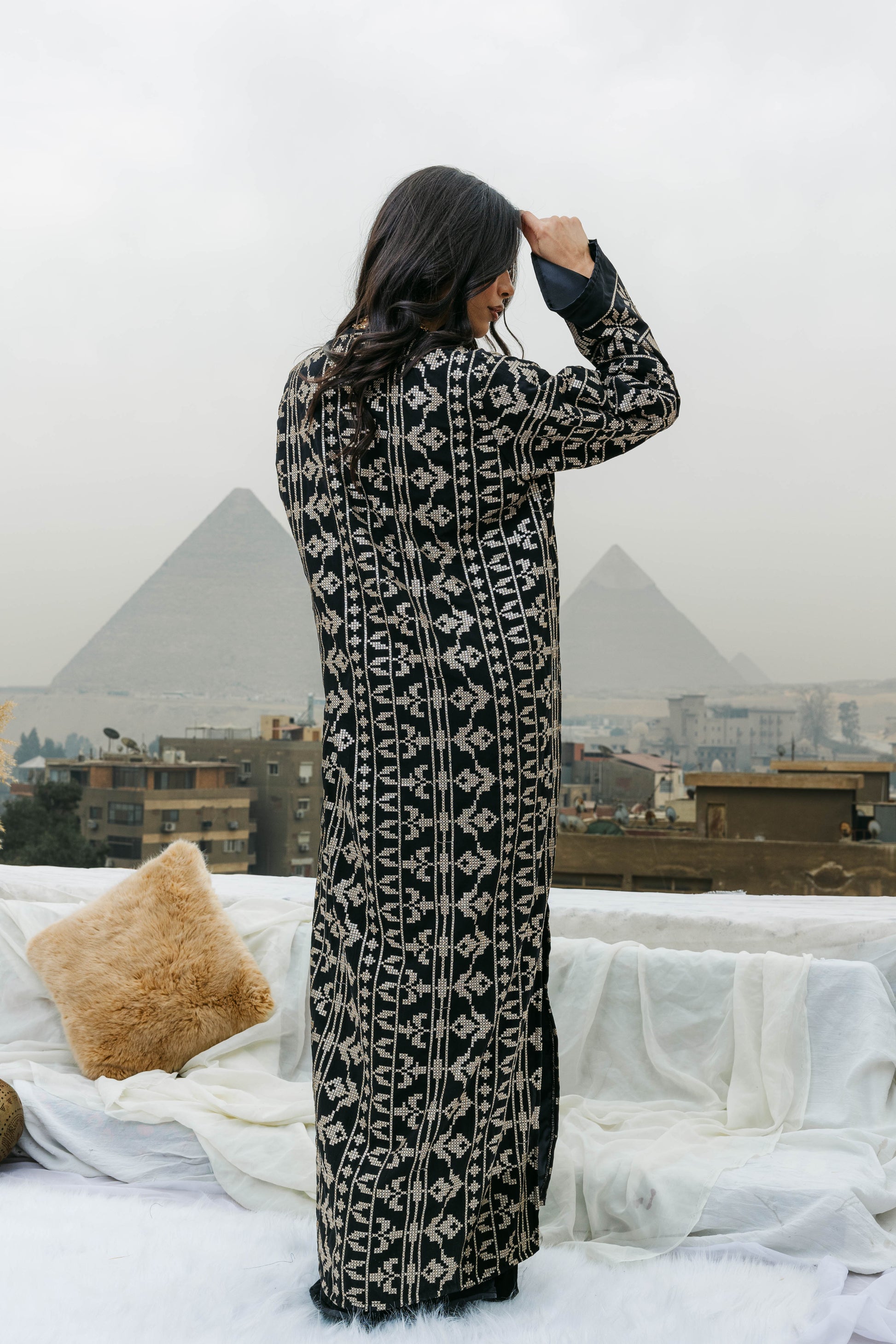 Crepe fully embroidered with threads and sequins, fully lined with soft satin. Stylish, comfortable, and perfect for Ramadan.