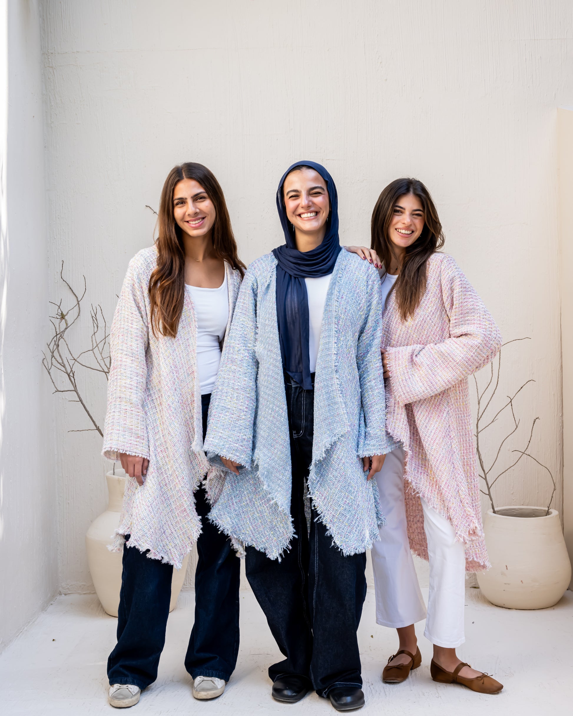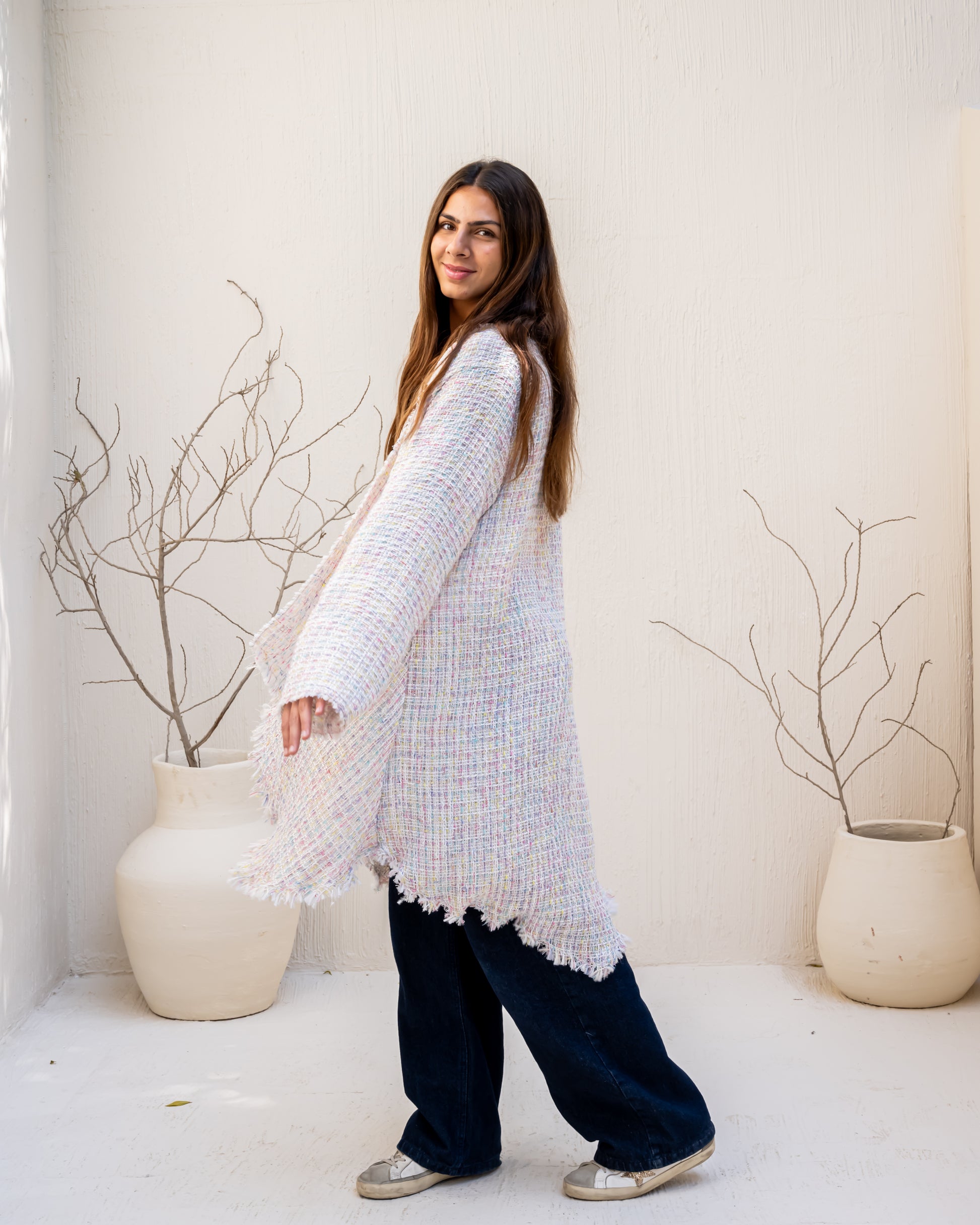 timeless elegance and comfort. Made from luxurious Bouclé tweed material, it features a soft textured finish that adds sophistication to any look.