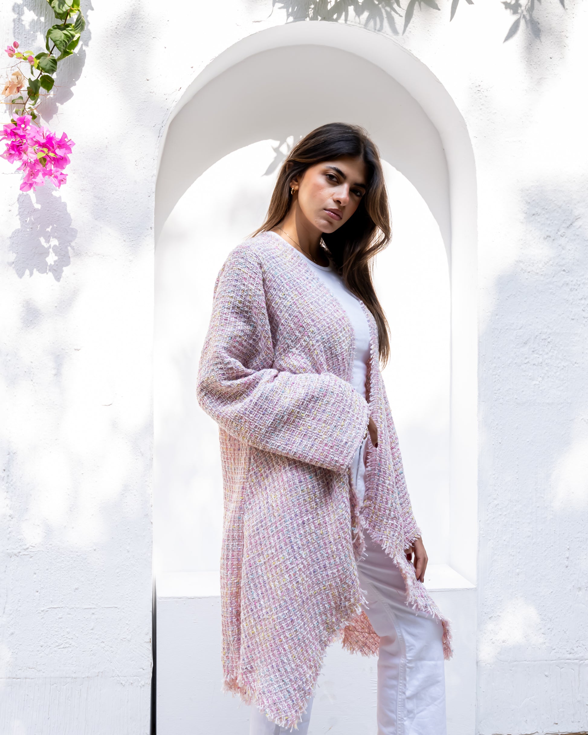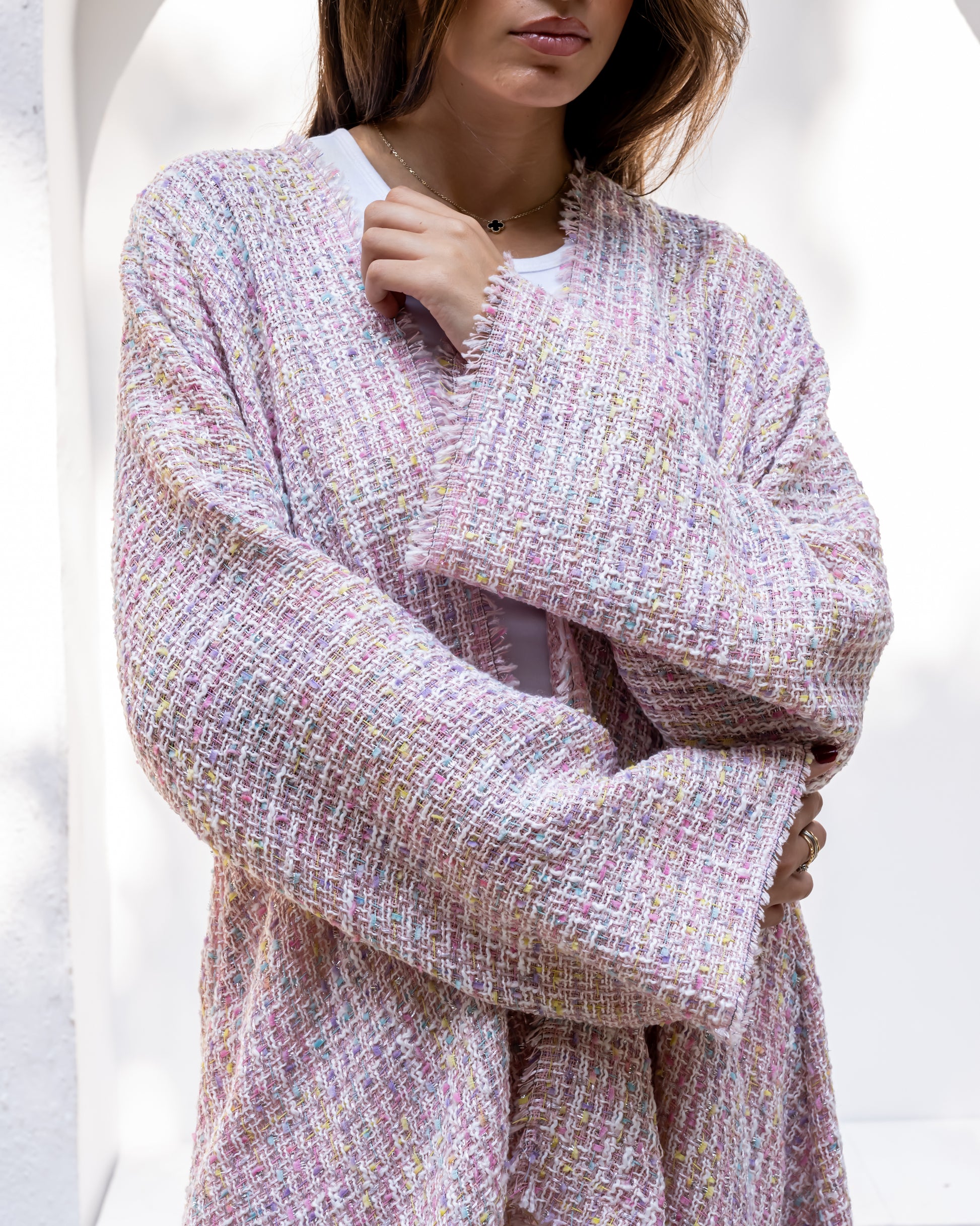 timeless elegance and comfort. Made from luxurious Bouclé tweed material, it features a soft textured finish that adds sophistication to any look.