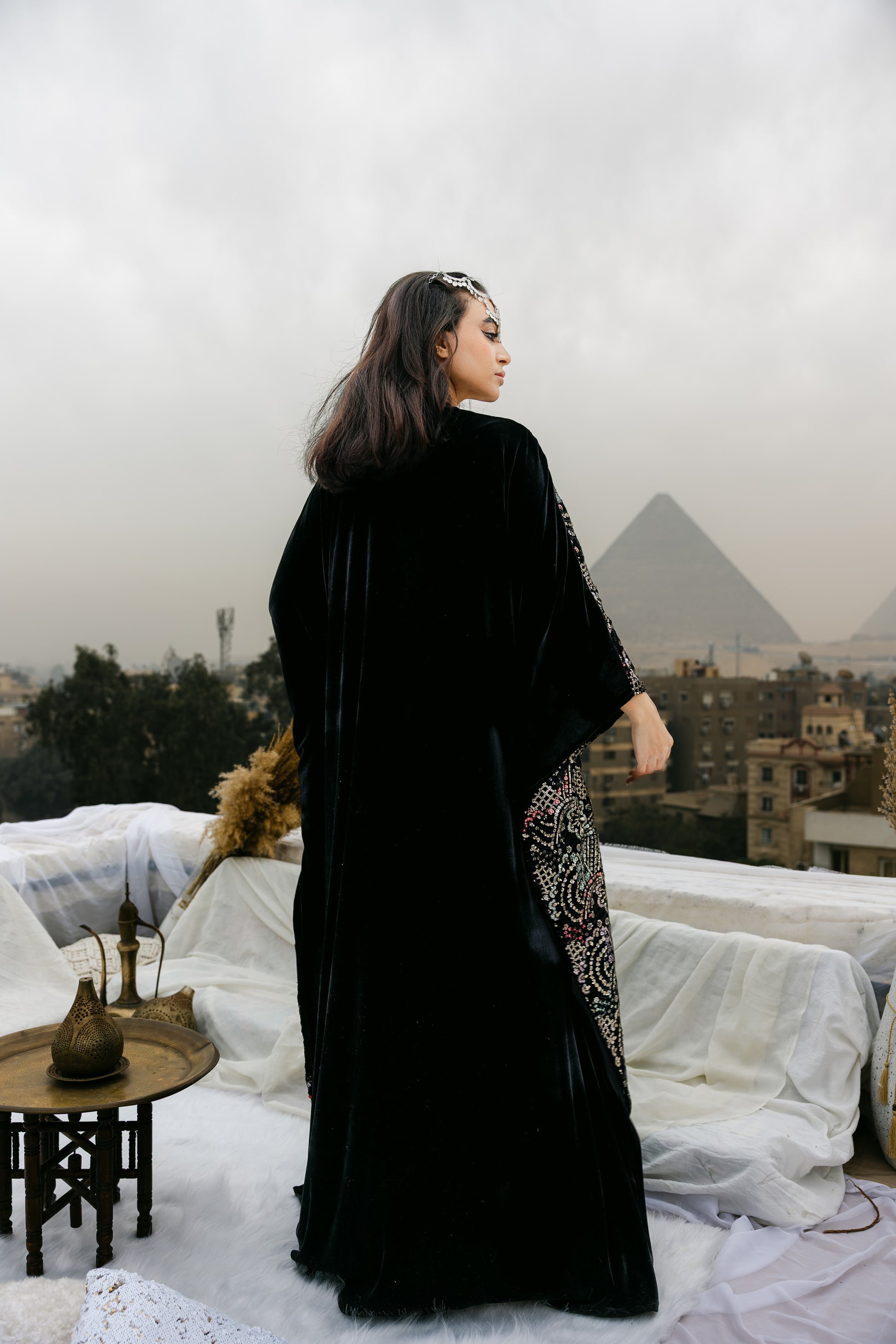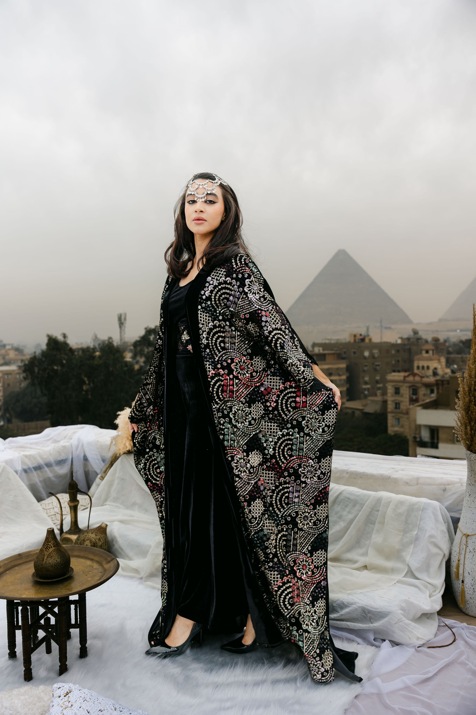 can be paired with a classic black velvet dress—perfect for evening gatherings and special occasions.