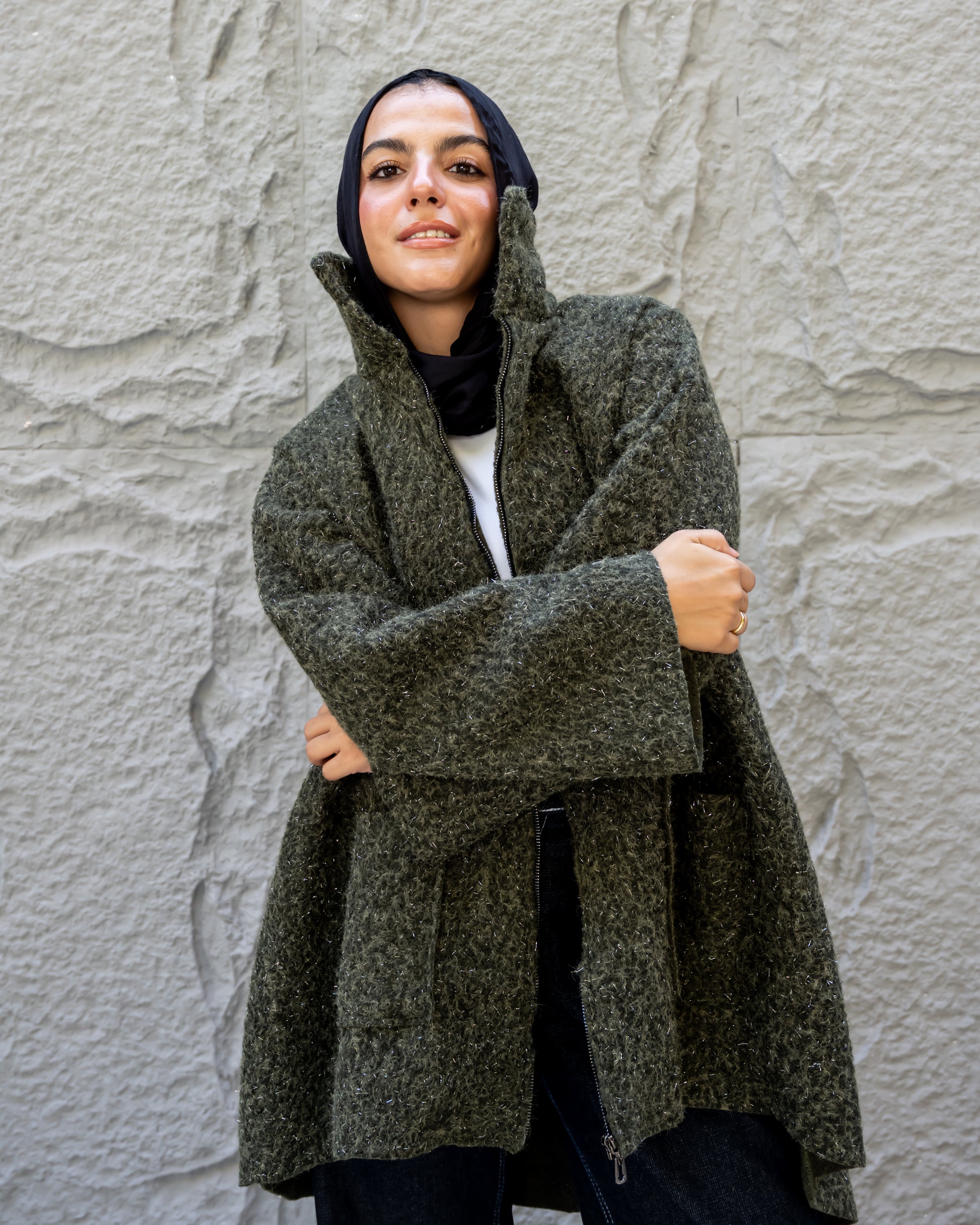 A chic blend of soft fur and textured bouclé fabric, designed in a timeless olive shade for an elegant winter look. Stylish, cozy, and perfect for any occasion