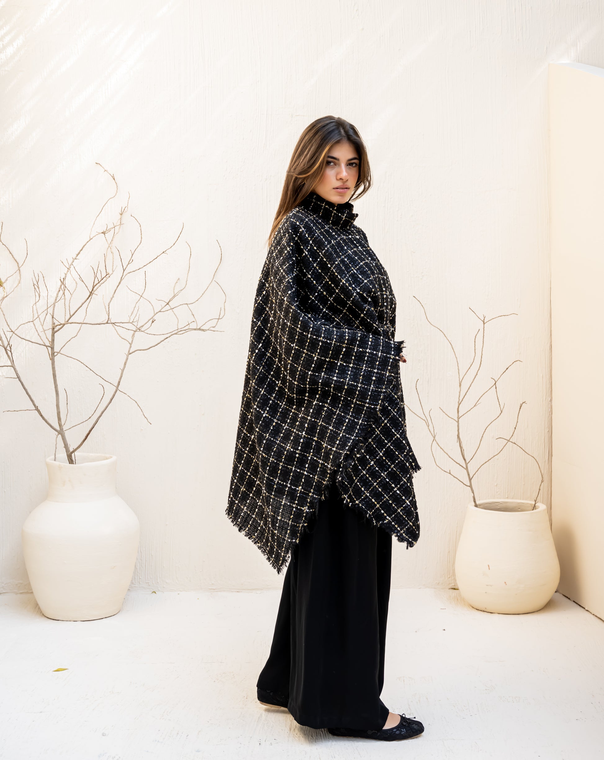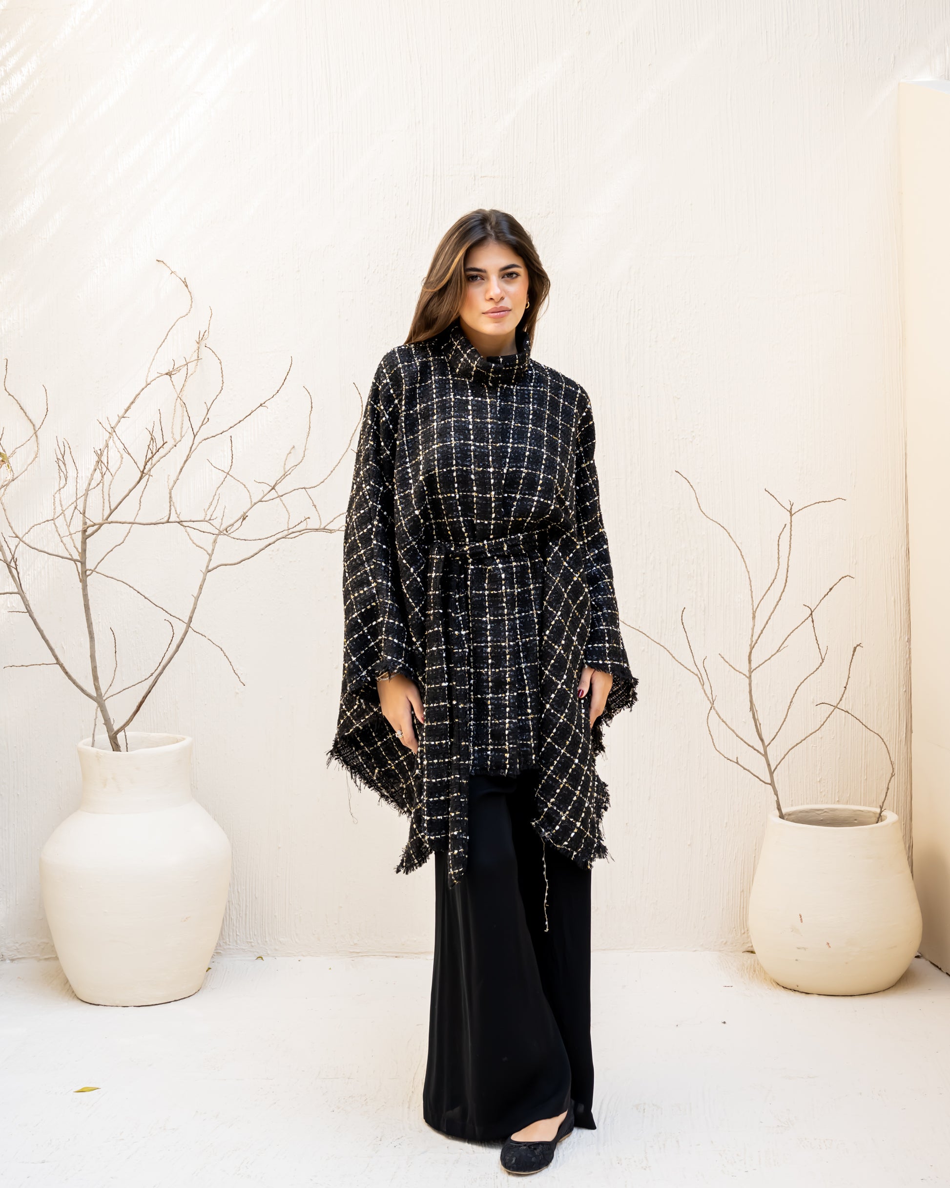 A timeless piece crafted from soft tweed fabric, combining elegance and comfort in a versatile one-size fit