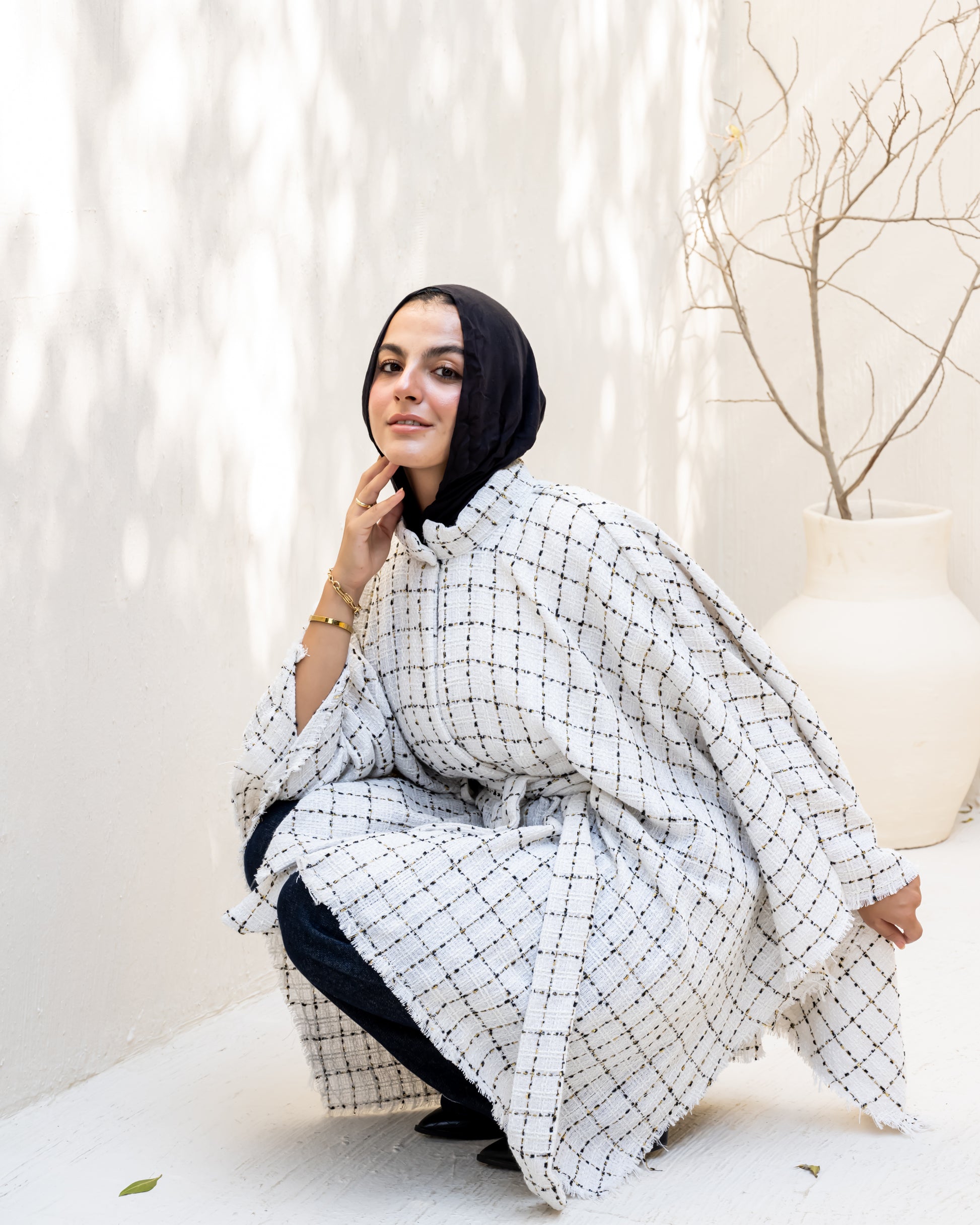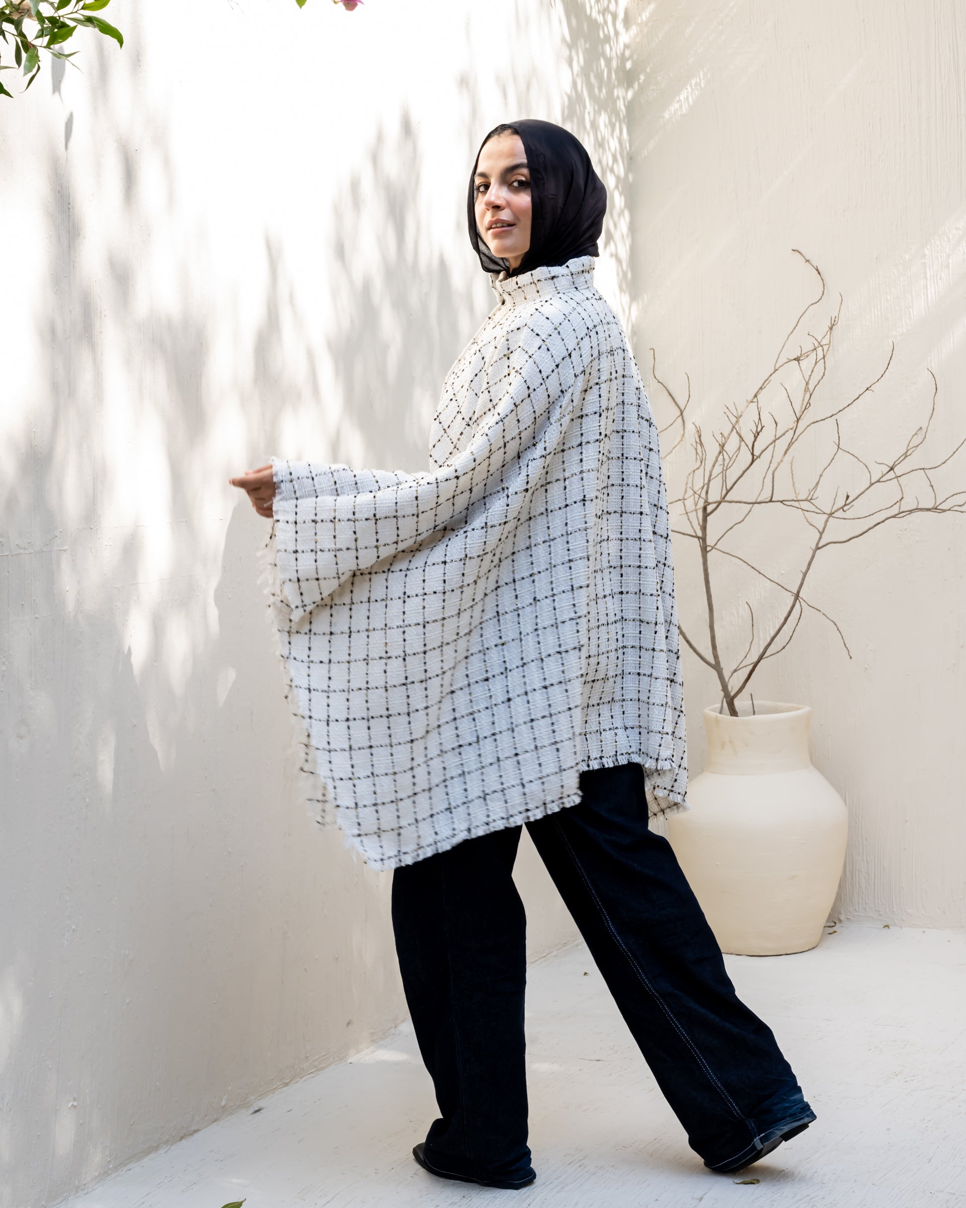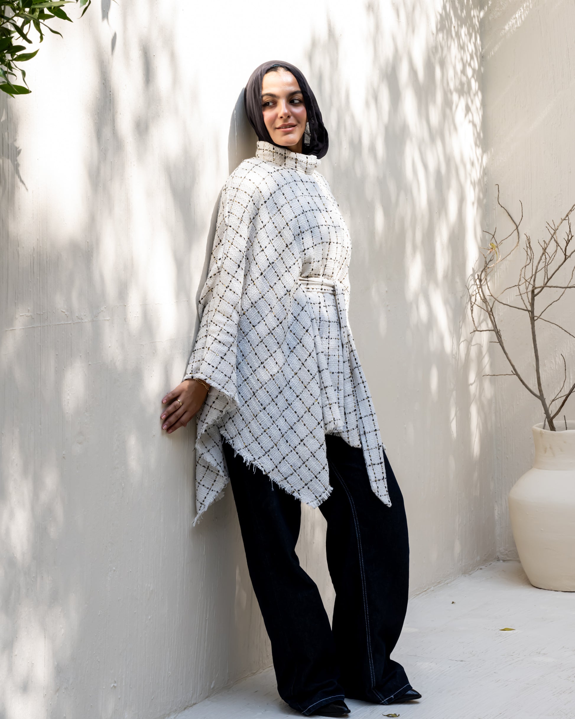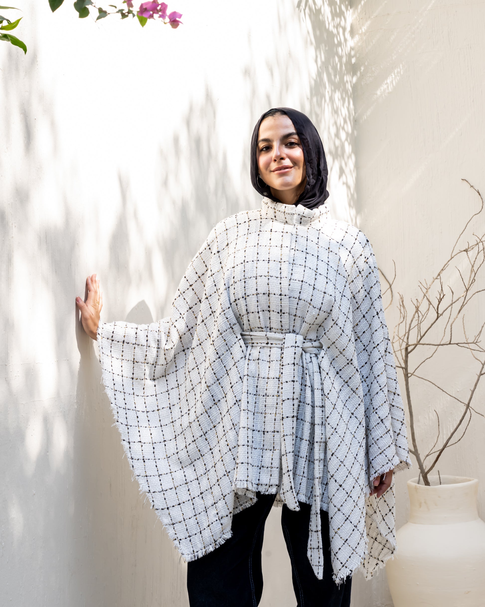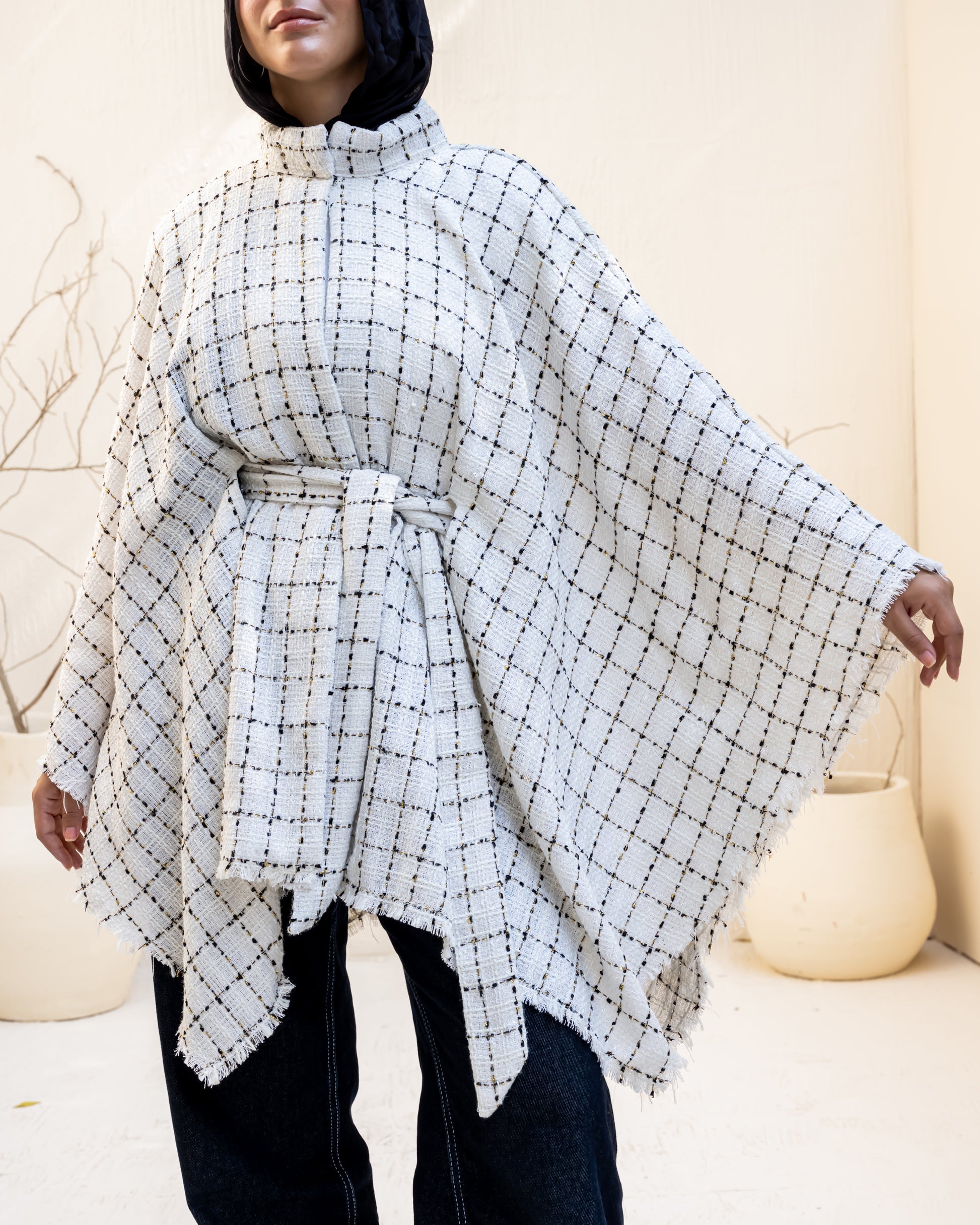A timeless piece crafted from soft tweed fabric, combining elegance and comfort in a versatile one-size fit