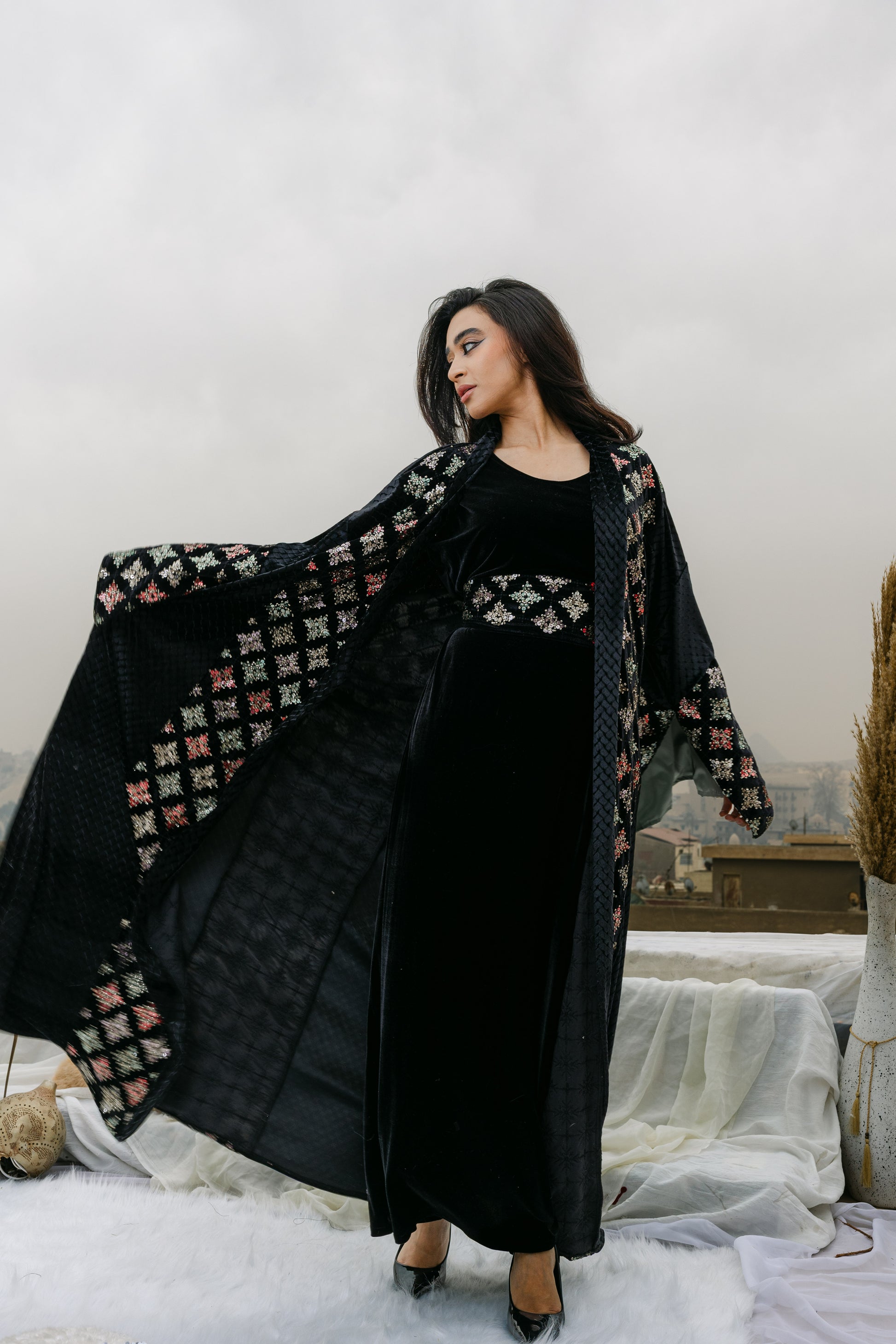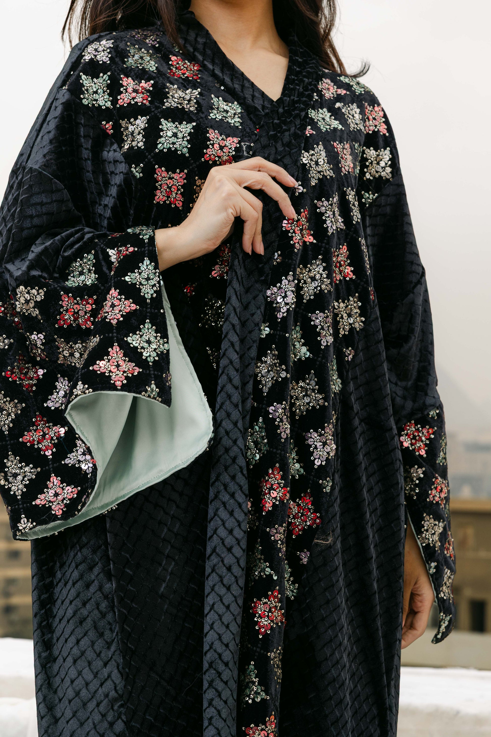 A refined abaya crafted from textured velvet and finished with delicate embroidery. Designed for elegant Ramadan nights, it offers a rich feel and a timeless silhouette that blends sophistication with effortless grace.